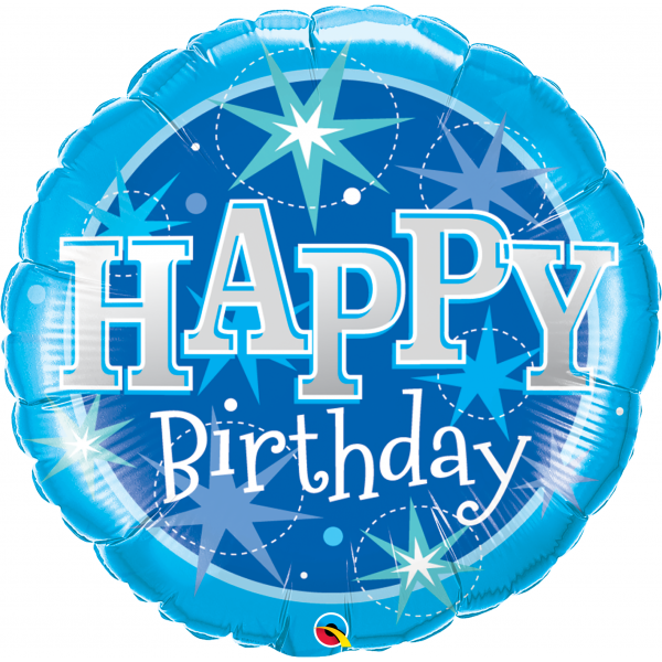 Foliový balón v tvare kruhu v modrej farbe s hviezdami a nápisom "Happy Birthday".